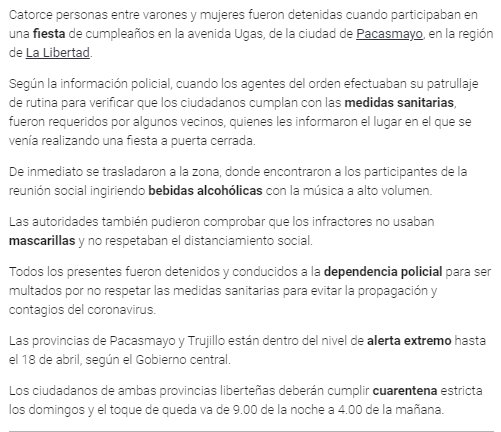 Al igual que la anterior nota, esta cobertura periodística también forma parte del tipo de cobertura habitual, pues el reportero informa que catorce personas, entre varones y mujeres, fueron detenidas cuando participaban en una fiesta de cumpleaños en la avenida Ugas, de la ciudad de Pacasmayo, en la región de La Libertad. Además, a lo largo de este contexto por la Covid-19, se ha visto que los policías han detenido a diferentes personas que incumplen con las medidas sanitarias. Las famosas "fiestas COVID", han sido puntos claves para que el periodista haga el reporte del día, y además, proponga esto, a su editar o jefe, como uno de los temas para el cuadro de comisiones.
